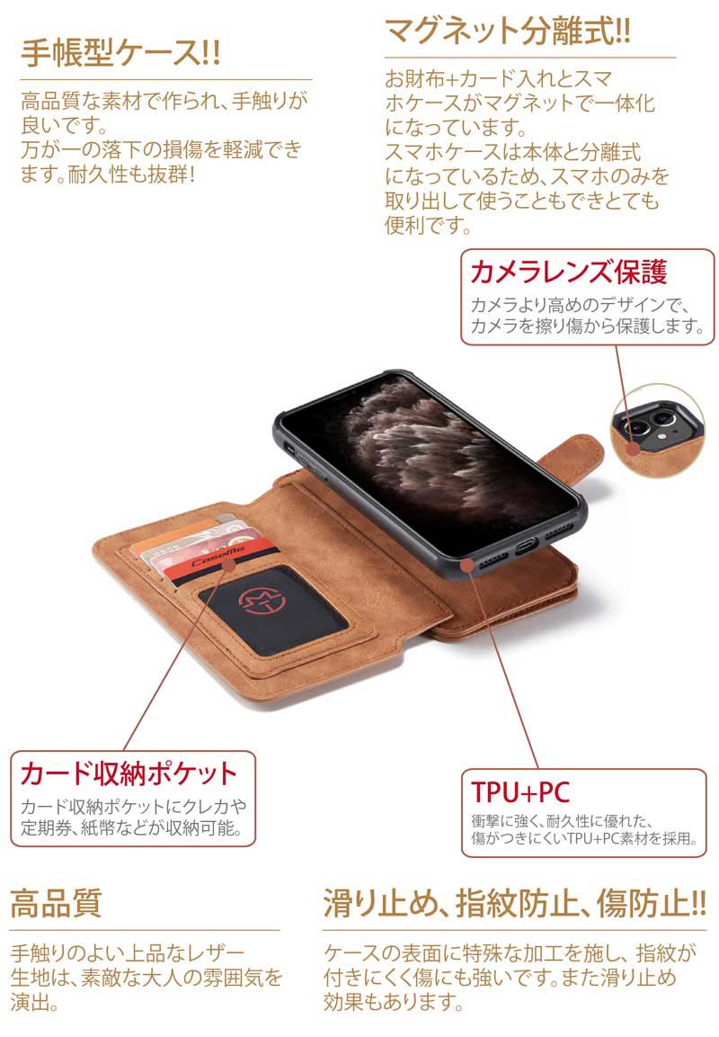 商品仕樣 商品名 iPhone マグネット分離式 手帳型ケース 素材 PUレザー+ TPU+PC 対応機種 iPhone SE 第2世代 iPhone 11 iPhone 11 Pro iPhone 11 Pro Max iPhone X iPhone Xr iPhone Xs iPhone Xs Max iPhone 8 、iPhone 8 Plus iPhone 7 、iPhone 7 Plus iPhone 6、iPhone 6 Plus iPhone 6s、iPhone 6s Plus カラー ブラック、キャメル、レッド 商品説明 1、手帳型▽ 高品質なPUレザー+TPU+PC素材で作られ、手になじむ質感で使い心地抜群! 2、マグネット分離式▽ お財布+カード入れとスマホケースがマグネットで一体化になっています。