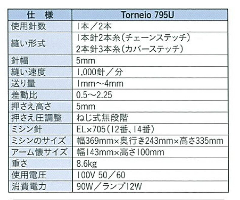 チェーンステッチ(1本針2本糸)【ミシン】【送料無料】【5年保証】 ジャノメ カバーステッチミシン Torneio-2 795U (トルネィオ ユー)【smtb-MS】【RCP】【最安値挑戦】 【ジャノメミシン】【ロックミシン】【カバーステッチミシン】【手芸用品】【ミシン本体】 家庭用では断トツの人気! 各メーカーカバーステッチミシンは販売しておりますが断トツで人気なのがこのジャノメトルネイオシリーズ!家庭用ミシンと変わらない操作性を追求されており、初めての方でも安心してお使いいただけます! 使い方が簡単なので初心者の方も安心! フリーアームになるので、袖付けに便利! 仕上がりをワンタッチ切り替えで選べる! 初めて購入される方 ワンランク上を目指したい方 ニットソーイングされる方 こんにちは!店長の澤村です!このトルネイオ 795Uの一番のおすすめポイントは通常はすべての糸調子ダイヤルで調節しなければいけないのがソフトな仕上がりやタイト(きつめ)な仕上がりをルーパー糸調子ワンタッチ切り替えでかんたんに変えれるところです!他のメーカーの機種には付いておりません。